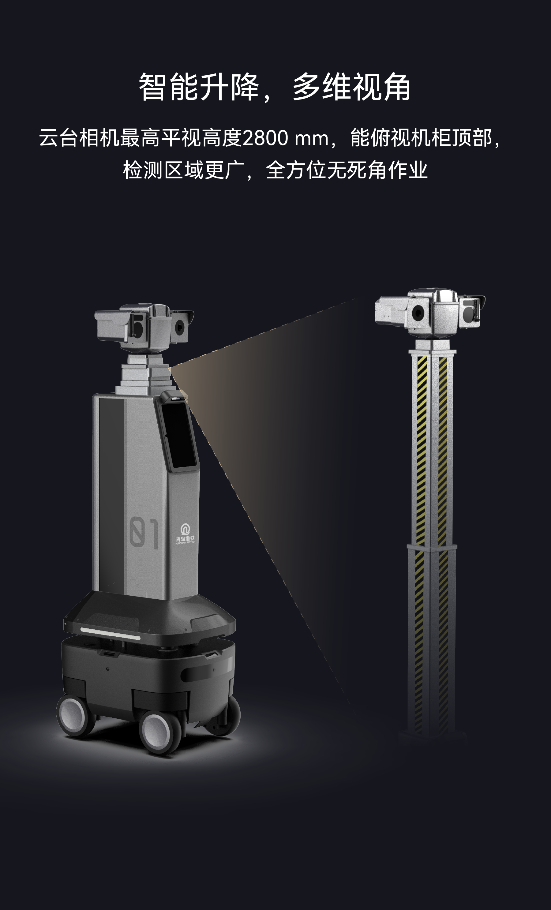 云台相机最高平视高度2800 mm,能俯视机柜顶部,检测区域更广,全方位无死角作业